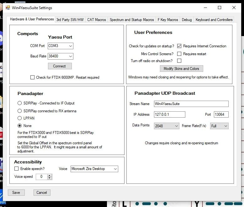 I do not understand Panadapter right now so I am not enabling this portion of the set up. I did however assign COM3 (will possibly be different on your computer) here is an opportunity to create some macros and assign some auto launch buttons, I decided for the sake of brevity in setting up I would just basically set it up and add macros and autolaunches as needed. Also if needed you can set the accessibility settings.